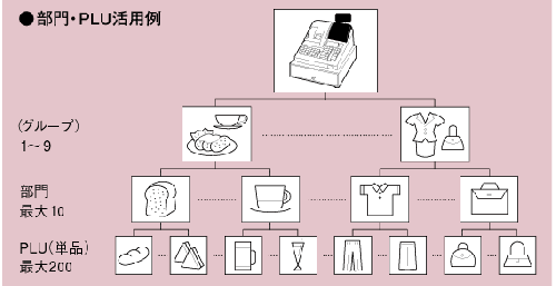 グループ・部門・単品別に売上を管理できる。9グループ・10部門・200PLU
