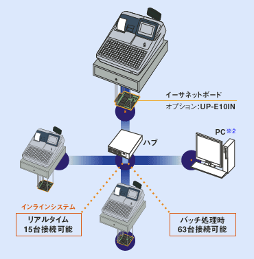 ● イーサネットボード(オプション)装着により、親機を中心に最大63台(バッチ処理時)までの子機との間で、インラインネットワークを構築することができます。(リアルタイム処理時は最大15台まで)